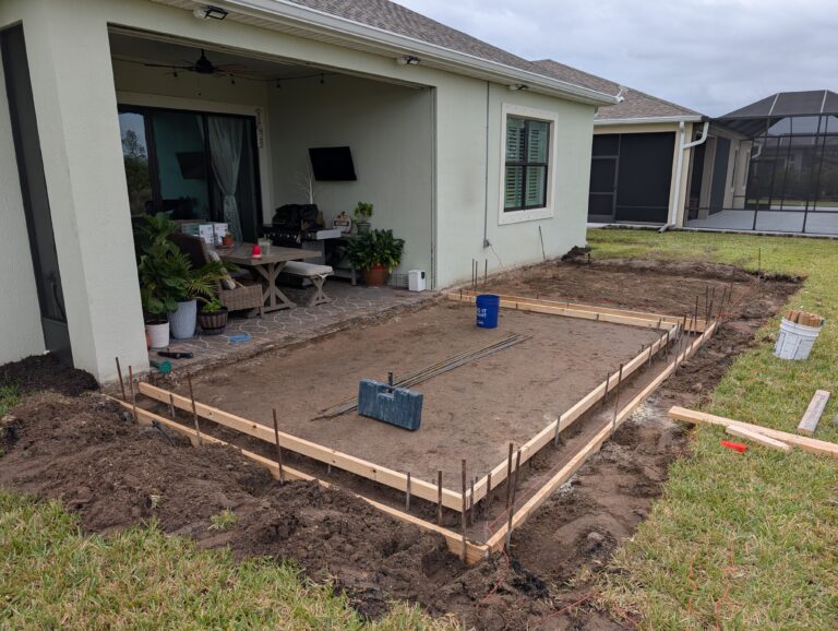 A screen enclosure, patio cover, or carport is only as good as the slab it sits on. An undersized, unlevel, or poorly drained concrete pad creates problems that show up in every structure built on top of it — anchor points that don’t hold, drainage that runs toward the home, and a surface that heaves and cracks as Florida’s soil shifts beneath it. We pour concrete patio slabs in Melbourne sized and graded for the enclosure or cover structure that goes on top. Free estimate, no trip fee. Call 321-300-5220.