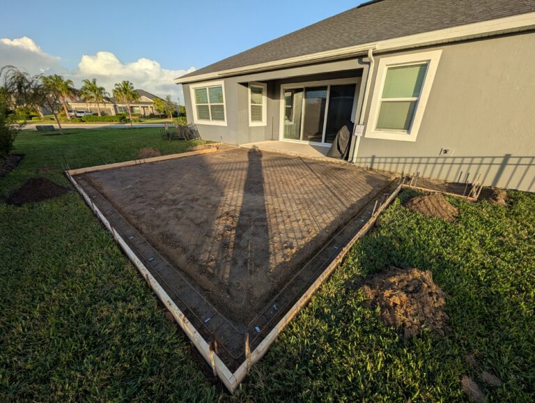 Drainage is the other Melbourne-specific factor. The afternoon thunderstorms that run through Brevard County from June through September deliver significant rainfall in short periods — a patio slab that isn’t graded to drain those volumes quickly will pool water on the surface and direct runoff toward the home’s foundation if the slope is wrong. For properties near the water in Indian Harbour Beach, Satellite Beach, and Eau Gallie, the combination of rainfall and tidal groundwater means drainage planning matters even more. HOA communities in Viera and Rockledge have specific requirements for impervious surface area and drainage management that factor into the slab design and permit submission. We serve Melbourne, West Melbourne, Palm Bay, Rockledge, Viera, Eau Gallie, Satellite Beach, Indian Harbour Beach, and all of Brevard County.